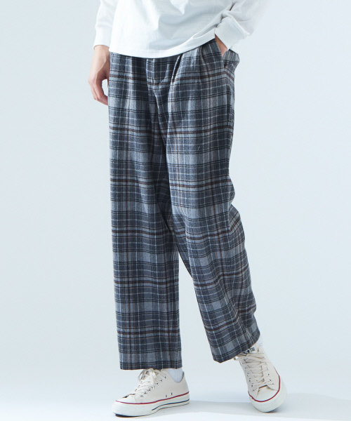 トレンド感のあるチェック柄を採用した、ビッグシルエットのワイドパンツ。ウールを使用した季節を感じる素材感もポイントです。model:H186 B92 W77 H91 着用サイズ:48