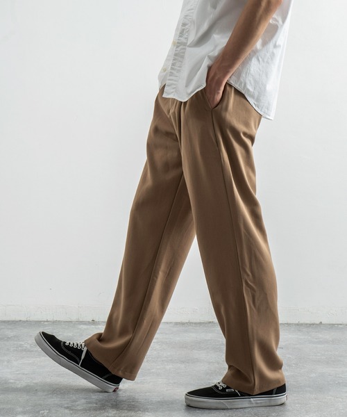 合わせやすいベーシックな無地に加え、チェック柄などをご用意したワイドパンツ。 腰周りと太ももはゆったりとし、裾にかけて若干細くなるテーパードシルエットを採用。 フロントに入ったタックで腰周りを大きく見せず、綺麗なパンツラインに仕上げています。 ■ 豊富なカラバリ 合わせやすいベーシックな無地に加え、チェック柄などをご用意した豊富なカラー展開。 それぞれに印象が変わりますので色違いで持っていても活躍できるオススメのパンツです。 ■ 厚手すぎない生地感と柔らかさが魅力 ベースはポリエステルを採用。厚手すぎない生地感で柔らかく、幅広いシーズンで着回しすることが可能。 チェックA柄のみ、程よい厚みがあり、うっすらと起毛した表面でふんわりした肌触りに仕上がっています。 また、チェックD柄以外にはポリウレタンが混紡され、自然な伸縮性がうまれ動きやすい作りです。 ■ 綺麗なパンツラインを作るタック 太いだけではなくフロントに入ったタックで腰周りを大きく見せず、綺麗なパンツラインに仕上げています。 穿きやすいのにスッキリとした見た目を両立できるシルエットを実現しました。 ■ スッキリとした見た目のテーパードシルエット 腰周りと太ももはゆったりとし、裾にかけて若干細くなるテーパードシルエットを採用しています。 スッキリとしたシルエットでありながら、快適な動きやすさを実現しました。 ■ ベルトループ付きのウエストデザイン フロントはシンプルなボタンを採用し、ジップフライ仕様で着脱もスムーズに行えます。 ウエストはベルトループ付きで、機能性にも優れています。 ■ 実用的なポケット サイドに2つ、バックに2つ、合計4つのポケットが施されています。 ポケットは一般的なスマートフォンがすっぽり収まる深さを設けた使い勝手の良い作りです。 =スタッフ着用コメント= ・モデル JOSEPH:身長176cm / 体重53kg 着用サイズ:M ウエスト:腰で穿いてベルトのいらない丁度良いサイズでした。 丈感:程良く足首に余る丈感でゆるっとした雰囲気でした。 ・スタッフA着用コメント:身長175cm / 体重65kg / 標準型 着用サイズ:L ウエスト:ベルトの必要がない、ジャストな着用感でした。 丈感:足首が綺麗に隠れる丈感で、今風のゆったりとしたシルエットでした。 ・スタッフB着用コメント:身長173cm / 体重75kg / ガッチリ型 着用サイズ:XL ウエスト:窮屈感のないピッタリジャストサイズでした。 丈感:少し長めで、足元にクシュっと余りましたが、シルエットに問題ありませんでした。 【お買い物をお楽しみいただく為に!】 ▼商品のお気に入り登録 完売カラーの再入荷通知や、ラスト1点の通知、セールの通知も受け取ることができます。 ▼ブランドのお気に入り登録 新商品や再入荷等、いち早くブランドのお得な情報を受け取ることができます!