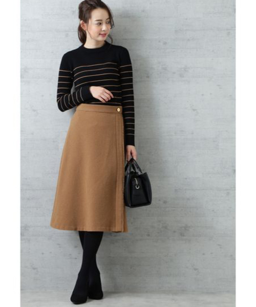 凸凹とした表面感のあるドビー素材で仕立てたフレアスカート。金釦をあしらったラップデザインに、さりげないフリンジディティールが程良い抜け感を演出してくれます。すっきりコンパクトな腰回りと上品なフレアラインで大人っぽく着こなせるのが嬉しい。今年らしいブルーと女子感あるベージュの2色展開です。着脱しやすいサイドファスナー開き。裏地付き。