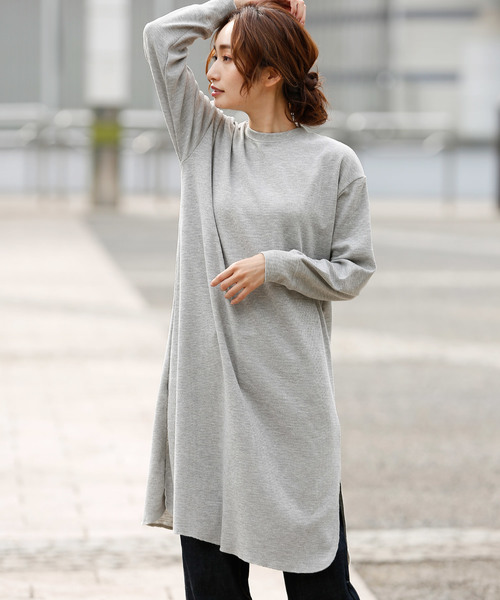 ラフな着心地のサーマル素材のひざ丈ワンピース。 肩の落ちたゆったりデザインで抜け感が出せるアイテム。 袖口がリブなので手元をスッキリ見せてくれます。 裾のスリットは動きやすく、レギンスなどボトムスを見せるコーデに最適です。 カットソーワンピースなのでデイリーウェアとして着回して頂けます。 *撮影場所やイメージにより実際の商品と色味が若干異なる場合がございます。商品のお色味はカラーバリエーション画像をご参照ください。