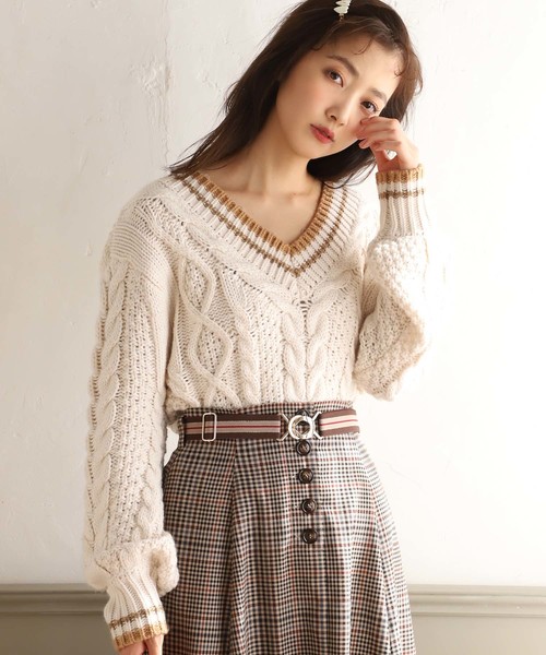 ~NICECLAUP 2018 Winter Collection~ ■トレンド感のあるチルデンニットが登場! フロントと袖が人気のケーブル編みになったトラッドテイストにぴったりのアイテム。 首元部分と裾に入ったラインがコーデを華やかにしてくれます。 Vネックなので顔周りもスッキリと◎ 程よくルーズ感のあるサイズなので、台形ミニやタイトシルエットのスカート以外にも カジュアルなデニムやワイドパンツ、スキニーなど幅広く合わせやすいデザインです。 ■スタイリング 無地のボトムはもちろん、レトロなドットやトレンドのチェック柄などとも好相性。 ラインがコーデにポイントをプラスしてくれるので、 アウターからもチラッと覗いておしゃれさもアップします!