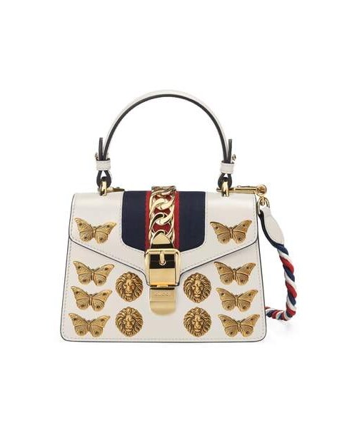 Fresh from Gucci's magical garden-themed collection, this stunning leather bag features the classic Gucci web-and-buckle design set off with the Sylvie chain and gilded lion heads and moths. Two optional shoulder straps, one in the Sylvie colors and one in smooth leather, add carrying versatility to the top-handle style. Style Name:Gucci Mini Sylvie Animal Studs Leather Shoulder Bag. Style Number: 5424452. Available in stores.