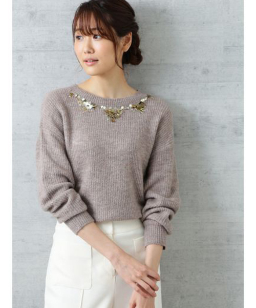 襟元にあしらったスパンコールディティールがポイントのプルオーバーニット。ウールにモヘアをブレンドしたふわっと柔らかな着心地が魅力です。表情のある畦編みにややルーズなシルエットでこなれた雰囲気に仕上げました。アウターインに着てもきらっと華やかな存在感のある1枚。 ※飾りの部分には、アイロンを当てないで下さい。