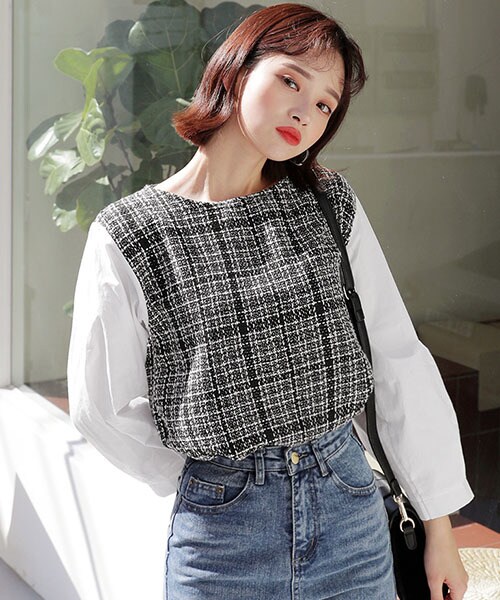 端正なラウンドネックで手元がすっきりとした袖丈。 ツイード生地とシャツ素材の切り替えデザインがおしゃれなきれいめカジュアルなブラウスです ※WEARに記載してある金額と、DHOLIC通販サイトに記載してある金額にシステム都合上、稀に誤差が生じます。正しい金額はDHOLIC通販サイトに記載された金額です。