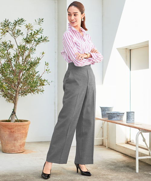 白黒のネップが、まるでウールネップの様に見え、程良いミックス感のある上品なグレーが高見えする素材ですが、実はポリエステル100%で、とても扱いやすい素材です。ワイドスタイルパンツを、足が短く見えない様に、太ベルトのハイウエスト仕様にし、かつ太ももの内側のシルエットをパターンで調整した、大人のストレートパンツです。裏地あり。
