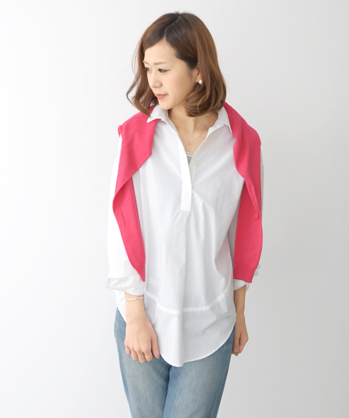 丸くラウンドされた裾が印象的なスキッパーシャツ。 ボタンを外し抜け襟にして着ていただくことができるので程よい抜け感を出して着ていただくことが出来ます。 小さめの襟、張り感のある生地、比翼になったボタン部分や全体のシルエットなど、女性らしく着こなしていただける魅力がたくさんある大人のシャツです。 店舗にてお問い合わせの際は、下記の品番をお申し付け下さい。 品番:DL12-M1011 model:H168 着用サイズ:FREE