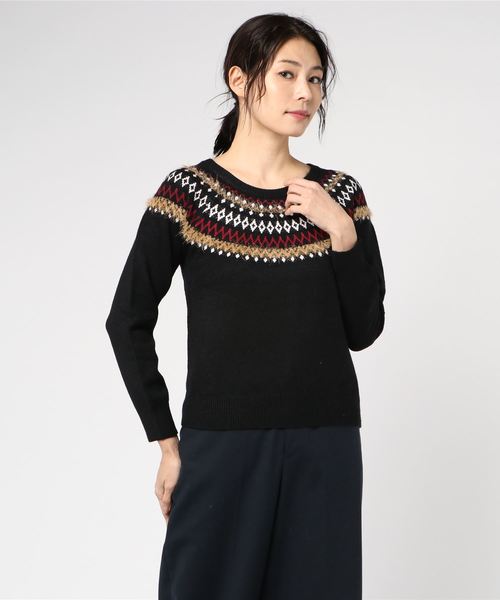■ジャガード編みが冬らしい1枚■ 肌触りがよく薄手で華奢な雰囲気のニットです。 フロントからバックにかけて全体に柄が編み込んであるので360°どこから見ても可愛い♪ デニムなどカジュアルなスタイリングから、オンアイテムとしても活用できます。