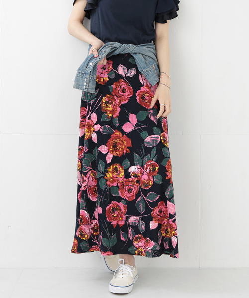 鮮やかなカラーで仕上げた花柄のオリジナルプリントを使用。カット素材で肌触りがよく、一枚でも透け感も気にならず楽に履けるスカートです。ウエストはゴム仕様で、履いた時にくいこみが無くウエストまわりがフラットできれいなラインになります。 トップスにはスウェットをチョイスして、旬な着こなしを。カジュアルMIXな着こなしがオススメです♪ Model : H165 B78 W56 H85 (cm) Size : 0 店舗へお問い合わせの際は下記品番をお伝えください。 品番:63-27-0095-391 ※画像の商品はサンプルです。 実際の商品と仕様、加工、サイズが若干異なる場合がございます。