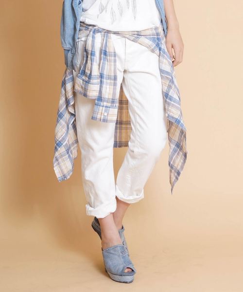 いつもの着こなしをこなれ感たっぷりに魅せるデニムボーイズパンツ! 爽やかなホワイトカラーで、ヴィンテージ感たっぷりに仕上げた1点です。 程よくゆったりしたサイジングはリラックス感のある大人のカジュアルコーディネートにピッタリです! model:H160 B82 W60 H88 着用サイズ:1
