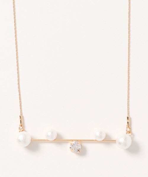 繊細なバーに大小のパール調ビーズやクリスタルをあしらったスタイリッシュなネックレス。 華奢なチェーンが女性らしさを引き立て、上品なルックスに仕上げています。 デイリーカジュアルからパーティースタイルまでマッチするデザインは、マストハブです。