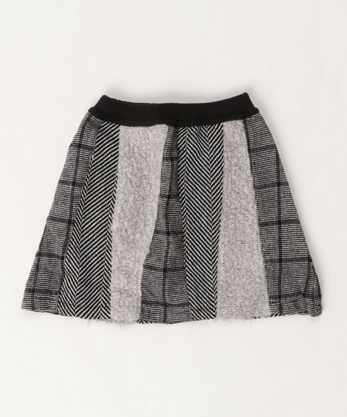 ウォーム感のあるブークレーやへリンボン、チェックなどをパッチワークで切り替えたスカート。ウエスト部分はリブ素材の総ゴムでお子様も着脱しやすいデザイン。シックなモノトーンとパープルを取り入れたブラウンチェックも今年トレンドのカラー。ragmart.Mono …シックなカラーと大人っぽいデザインにキッズならではのキュートさをプラスしたガールズスタイルを提案。