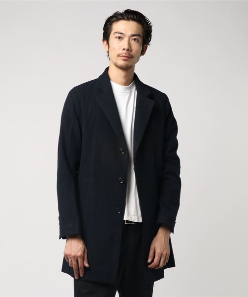 【REQUEST】ベーシックラインのチェスターフィールド。肌にやさしくチクチクしない「フェルトン」を使用し、着心地のいい総裏地仕立て。「フェルトン」はポリエステル/レーヨン/ポリウレタンの繊維がフェルトの様に絡み合い、厚手のウールメルトンの様な重厚さと保温力を兼ね備えながらも、軽量でしなやかな質感が特徴の化学素材。シンプルでオン・オフ兼用できる洗練されたデザイン&シルエットで、気軽に羽織れて上品にまとまるコートです。