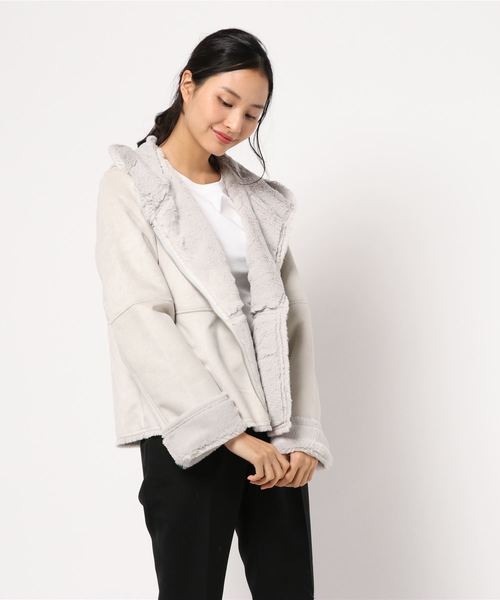 すっきりとしたAラインシルエットで上品な印象に仕上げたフェイクムートンライダースブルゾン。シンプルなデザインにすることで、フェミニンな印象を与え、合わせやすいのもポイントです。着丈の短いアウターはワイドパンツやボリュームスカートと相性が良く、バランスを取りやすいので1枚あると重宝すること間違いなしです。 <ひと言ポイント> ・とても肌触りの良いフェイクスウェードの生地を使用しています。 ・大人カラーのモカとライトグレーの2色展開です。 ・ヒップが隠れる着丈感なので、体型を気にしている方や腰を冷やしたくない方にもおすすめ。 ・フード付きなのでカジュアルにも綺麗目にも合わせやすいデザイン。