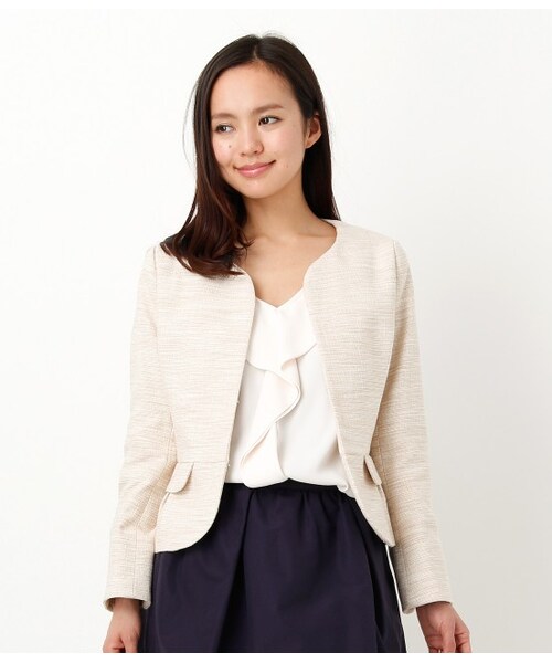 華やかなラメ入りツイード素材を使用。首まわりを優しい雰囲気に見せてくれる丸みのあるカッティングがフェミニンさを強調してくれます。上品な印象で入学式などのセレモニースタイル用にもぴったりの一枚です。