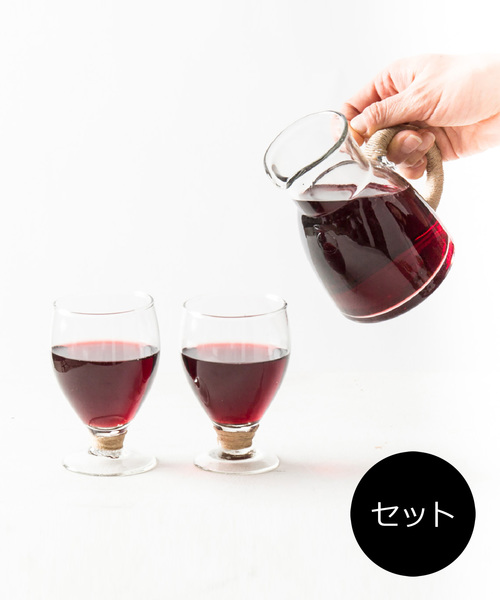 ジュートが巻き込まれてアクセントになった手吹きガラスのワインセット ▼特徴 ・職人がひとつひとつ手作りしています。 ・ジャグとワイングラス2個が入ったお得なセットです。 ・ジャグの持ち手とグラスの凹み部分のジュートがアクセントになっています。 ・ひとつひとつが手作りですのでサイズ・厚さなどが多少異なる場合がございます。ご了承ください。 ▼サイズ ジャグ:約 直径11×高さ17.5cm(容量 400ml)・上部直径7.7cm、ワイングラス:約 直径6×高さ10.5cm(容量 200ml)・上部直径8cm ▼バリエーション(サイズ以外) ・クリア(クリア) ▼その他仕様 ー ▼注意 ・ひとつひとつが手作りですのでサイズ・厚さなどが多少異なります。ご了承ください。