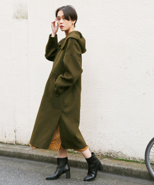 ゆったりデザインのフードコート 柔らかい素材感の接結ウール生地を使用したフードコート。ビッグシルエットで優しくリラックスした雰囲気ですが、両脇の裾の切れ込みが少しモードっぽい印象に。 大きめのフードは後ろから見たときにポイントになります。