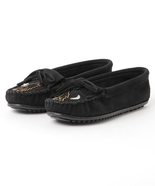 ミネトンカ×刺繍作家・小林モー子氏とのコラボアイテム。<br>定番<キルティ>をベースに、星、月、オオカミを繊細なビーズ刺繍で<br>描いたユニークな一足です。<br>■小林モー子オートクチュールのビーズ刺繍技術を学ぶ為、パリに渡り修行した後、自身のブランド<br>「MaisondesPerles(メゾン・デ・ペルル)」を立ち上げ。<br>フランスの伝統的なオートクチュール刺繍の技法を用い、一針ずつ手仕事で作品を制作。<br>ユニークなデザインと高いクオリティのブローチやピンが人気です。 品番:ACD4100
