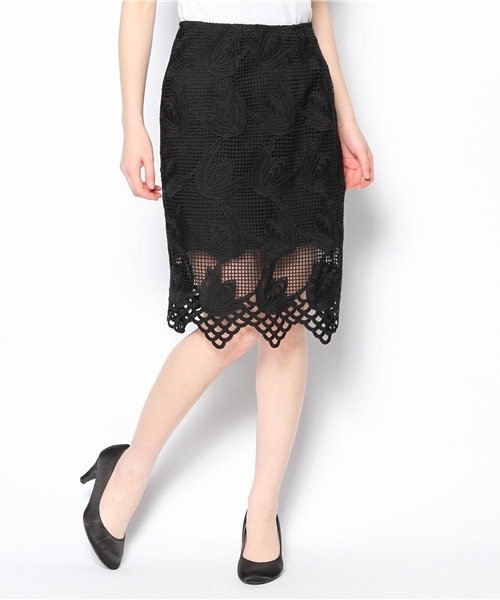 レースペンシルスカートレースを使いシーズンライクな軽さのあるシルエットにメイクしたペンシルスカート。ボディにフィットするタイトフォルムで、ボトムの華奢見え効果も狙える上品な一枚。裾のスカラップがより女らしさを引き立てます。トップスにカジュアルアイテム合わせが今年らしいスタイルです。model:H160 B78 W60 H81 着用サイズ:SMALL
