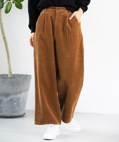 季節感のあるコーデュロイ素材を採用単色仕様で仕上げたストレートワイドパンツ。ストンとした落ち感のスタイルよく見えるラインにこだわりました。人気のハイウエスト仕様で、トップスをインした際にウエスト周りのシルエットが綺麗に見えるひと品。また、バックウエストはゴム仕様になっており、リラックスして快適に着用いただけます。今季はショート丈トップスと合わせたり、ベレー帽やスニーカーなど、小物で遊びを効かせたコーディネートもオススメです。 ・ジップフライ。