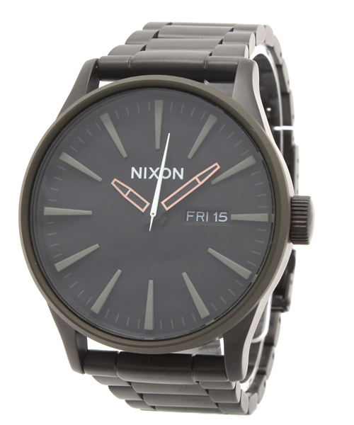 NIXONの新作は、元来のウレタンバンドからステンレススチールバンドへ仕様をアップデイトし、且つBLACK×GREYのクールなカラーリングで登場した人気種“Sentry”。 シンプルながらもGREYカラーのバーインデックスやベゼルが漆黒のケースデザインと相まって存在感があります。質感の良さでダークなコーディネートを逆手にとったお洒落を楽しめること間違いなしな1本です。 ■100m防水 ■付属:取扱い説明書・保証書(2年間保証) 【NIXON】 Nixonは、カリフォルニア州エンシニータスに拠点をおいて、サーフ、スケート、スノーの3Sスポーツをする人々の間で求められる”ライフスタイルウォッチ”をテーマに、Andy Latts(アンディ)とChad Dinenna(チャド)がスタートさせたウォッチカンパニーです。 ※商品お届けの際の納品書は、お買上日を証明する書類として保証書と共に大切に保管して下さい。(コマ詰めや、修理などの際に必要となります。) ※コマ詰めを必要とする場合、市販の専用工具をお持ちであればお客様ご自身でも調整が可能ですが、NIXONのメタルベルトのコマ抜きは非常に硬く、工具を破損してしまう恐れもありますので、BEAMSの店舗へお持ち込み(無料)いただくか、一般的な時計店への持ち込み(有料)をおすすめ致します。 <PREMIUM MEMBER 会員について> 付属の申込ハガキを郵送すると、PREMIUM MEMBER会員に登録されます。PREMIUM MEMBER会員に登録されますと、故障などのアフターサービスのダイレクト受付、電池の無料交換サービス、その他お得な情報のお届けなど、様々な特典がございます。店舗へお問い合わせの際は下記品番をお伝えください。 品番:33-22-0563-665