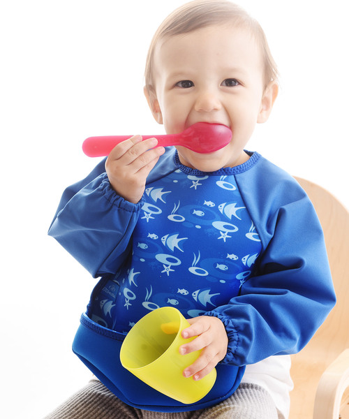 ※2025年7月より販売価格を改定しています。 ウェットスーツ素材と防水素材でできた、とっても軽くて軟らかい袖付きのベビー用エプロン ●裾をまくれば、立体的で大きな食べこぼしキャッチ用ポケットが登場!床に落ちる食べこぼしも減るので、お掃除も楽ちん♪ ●本体はウェットスーツの素材(ネオプレン)でできているので、食べこぼしや飲みこぼしも徹底ガード!吸水性のある表面で水分をキャッチ!インナーのゴムが表面でキャッチした水分の浸透を防ぎます。ネオプレンは耐久性のある素材なので、長い期間使用することができてお財布にも優しい商品です☆ ●袖部分は柔らかな防水素材。袖口はゴムギャザー入りで、中に着ているお洋服の袖口をしっかりカバーします。 ●ラグラン袖への改良により肩や腕が動かしやすくなり、よりお子様の「自分で食べたい」気持ちをサポートします。 ●洗濯機&乾燥機使用OK! ●5つのデザイン賞をはじめ、ヨーロッパで数々の賞を受賞!イギリスのライフスタイル誌「Junior」が主催する2012 Junior DESIGN AWARDSではデザイン賞を受賞していて、イギリスでも大人気のベビー用エプロンです! ●推奨年齢:6ヶ月~3歳半頃まで 【お手入れ方法】 1.大きな食べ残しを洗い流します。 2.油分汚れがある場合は、洗剤でもみ洗いし、すすぎます。 3.首元のマジックテープを留めた状態で洗濯機で洗濯します。(漂白剤使用不可) 4.乾燥機も使用ができます。(乾燥機にかければより殺菌効果があります) ※製品加工上、開封時に染料の匂いを感じる場合がございますが、複数回のお洗濯とご使用を続けていく事により匂いは軽減されます。 ご注意 ※完全防水ではございません。 ※手洗い、手絞りのみでは雑菌が繁殖しカビが発生する原因になるおそれがございますので、洗濯機での洗浄を推奨いたします。 ※ご使用前に単品で洗濯してください。 ※濡れたまま放置すると色落ちすることがあります。 ※ご使用時と同様に裾をまくって干すことで乾きムラがなくなります。 ※輸入品の為、予告無くパッケージや仕様が変更される場合がございます。予めご了承下さい。 ※入荷時期によって素材が異なる場合がございます。予めご了承下さい。 ※生産時期やロット等によりカラーが若干異なる場合がございます。予めご了承下さい。