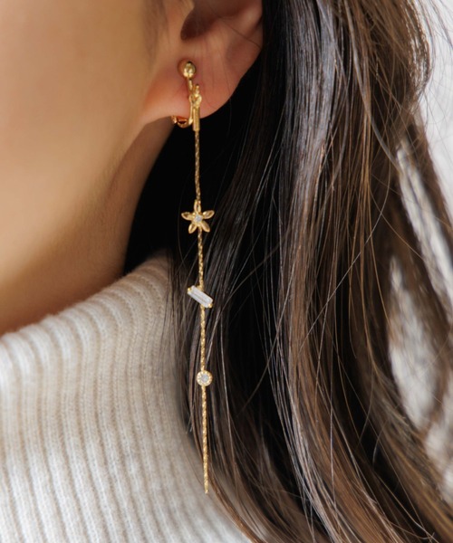 お花とストーンの華奢なきらめきのフラワーオリジナルのアシンメトリーデザインのロングピアス。ゆらゆら揺れるロングチェーンのパーツが女性らしく演出してくれます。コーディネートにフェミニンな雰囲気をプラスしたい時に。華奢なデザインなのでどんなアイテムでも合わせやすく活躍します。細いチェーンについた細かなパーツで控えめな華やかさを。【お買い物を上手にお楽しみいただくためのPOINT2つ】◎ 購入ボタン横の ♡ (ハートマーク)をクリック! 完売カラーの再入荷通知、残り1点の通知、セールの通知を受け取れます。 (クリックまたはタップで商品のお気に入り登録♪)◎ ショップのトップページにある ♡ (ハートマーク)「お気に入りショップに追加」をクリック! 新商品や再入荷等、いち早くブランドのお得な情報を受け取れます。 (ブランドのお気に入り登録♪)