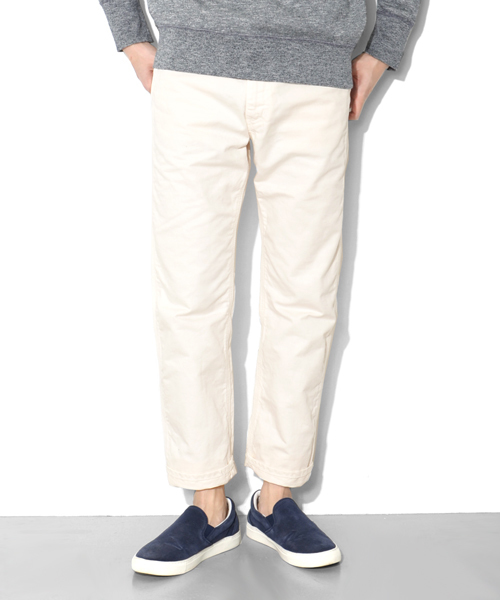 打ち込みの良い生地を使ったDOORS定番の5Pパンツ。 生機(きばた)に近い少し生成りがかった生地を選ぶことで、ワークウェアのような自然な色みのホワイトパンツに仕上がっています。 店舗にてお問い合わせの際は、下記の品番をお申し付け下さい。 品番:DM12-4019 model:H181 着用サイズ:38