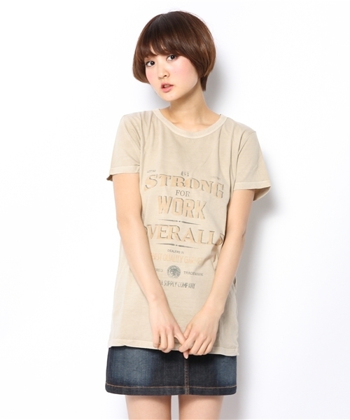 ランバーエプロン(古着の広告入りワークエプロン)風のプリント柄はgoaオリジナル! 古いワークウエアの広告の標語のように“仕事用に強い”“オーバーオール”“最高品質の衣料”などの意味を持つロゴプリントになっています☆ メンズライクなサイジングなので、スキニーパンツなどのタイトなボトムとも相性◎ model:H168 B80 W58 H84 着用サイズ:FREEベージュ/カーキ model:H163 B86 W60 H87 着用サイズ:FREE