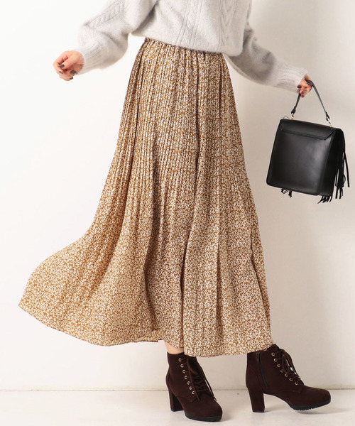 ■オールシーズン使えるモードな花柄スカート■ 上部に入った細かめのプリーツが裾に向かって消えていくので広がり過ぎないシルエット。 やわらかい印象で歩いたときの裾のニュアンスが◎ ウエストゴムでラクチンなのに上品に見えるロングスカートです。 トップスの合わせ方でいろんなスタイリングを楽しめます。