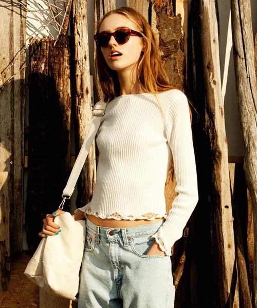 Kastane(カスタネ)カタログにも掲載しており大好評のかぎ針リブニット。コンパクトなサイズ感と、裾のダメージがポイントで、一枚で主役としてはもちろん、羽織やビスチェ等とのレイヤードも楽しめそうな一枚。
