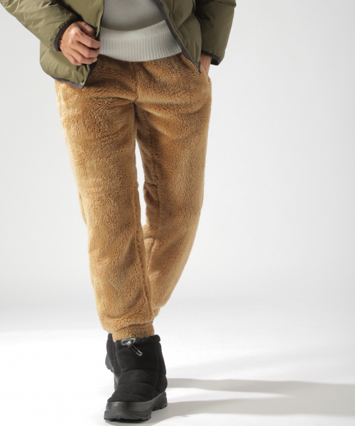 シェルパフリース素材のリブパンツ。保温性が高く真冬にも活躍してくれる1枚です。配色や異素材ミックスでメリハリのあるコーディネートがおすすめです。