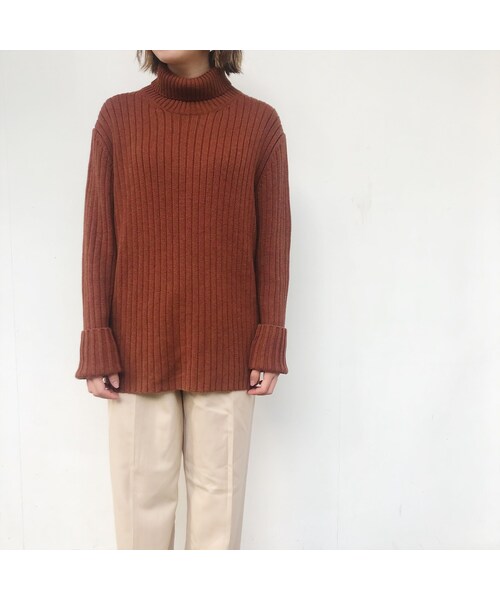 size 表記 L ( 着丈64 身幅50 肩幅40 袖丈64 ) 100% COTTON 161cm 着用。 太めのリブが可愛らしいタートルネック。 程よくゆったりとしたシルエットで、タックイン、アウトどちらでもバランス取りやすいかと思います。 お洒落なテラコッタカラーです。