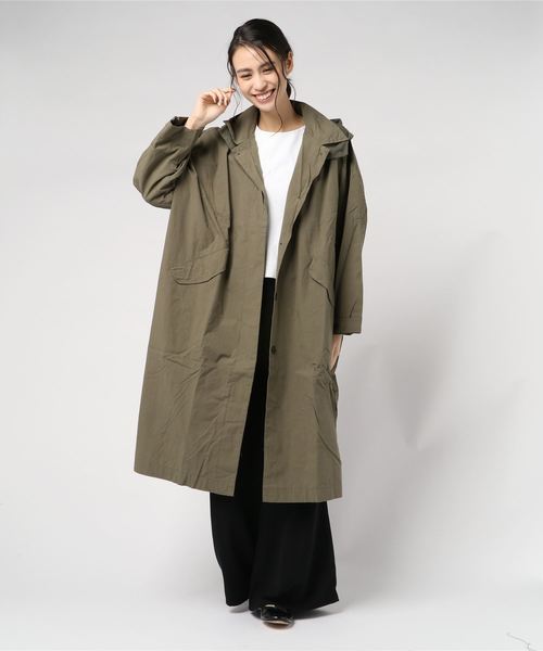 ■ トレンドのワイドシルエットコート ■ ドロップショルダーで、 フード取り外し仕様のBIGシルエットコート!! フードが取り外し出来るデザインで、ステンカラーコートとしても着る事が出来ます。オーバーサイズにデザインされているので、フォルムが可愛らしく、インパクトがある為、ポケット等のデザインはなるべくソリッドにデザインされています。[インナーダウン]やトレンドの[ボアアイテム]、[スウェット]との相性も良く、レイヤー(重ね着)コーディネイトに最適なアイテムです。 オリジナルで織り上げた高密度チノクロス!! コットン100%の糸を使い、高密度に織り上げたチノクロスは防風効果が望め、インナーアウターとの組み合わせで寒い冬にも対応が可能です。コットン100%であることから自宅で洗濯が可能です。 秋、冬、春と3シーズン活躍する万能アウターアイテムです。