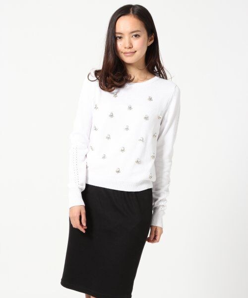 手付けされたビジューがポイントのニットプルオーバーです。袖の部分のアイレットがポイントで春先まで着て頂けます。程よいショート丈が幅広いボトムと合わせて頂けます。