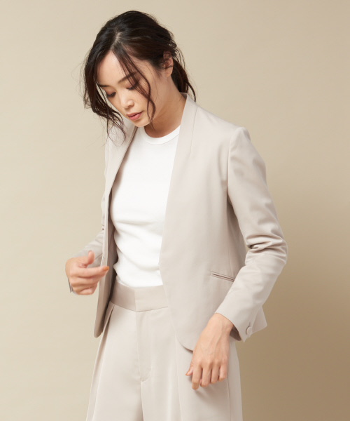セットアップで使える!洗練ジャケット*Detail*コットンライクなポリエステル生地のノーカラージャケット。ミニマルなデザインがスタイリッシュで洗練された印象です。クルーネックと緩やかなVラインが程よい抜け感を作り出します。オフィス、フォーマルシーン、デイリーまで幅広く活用でき1着あると便利なアイテム。*Coordinate*ノーカラーでどんなインナーとも好相性◎同素材のワイドパンツとセットアップでお使いいただくと、きれい目ながらも、今季らしいスタイリングが完成します。コットンライクなポリエステルを使用した生地でハリ感をだしました。シワになりにくいのも嬉しいポイント。ソフトマットな光沢で品がありリュクスな雰囲気です。