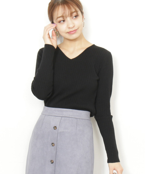 着こなしの幅を広げるワイドリブニット。Vネックラインとボディラインをすっきり見せてくれる心地いいフィット感が、女性らしいシルエットを引き立てます。ボトムスを選ばずに着回しができる万能さが、ワードローブに欠かせないアイテムです。
