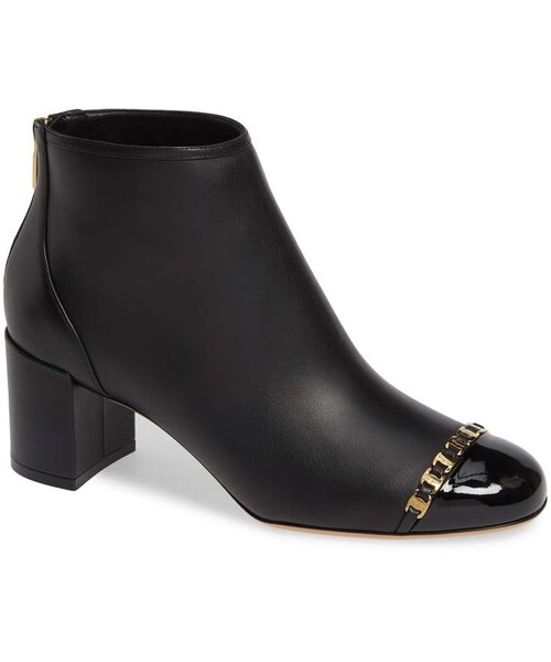 Logo-stamped chain-links edge the glossy cap toe of a bootie that makes both a first impression and a smart finish to any outfit. Style Name:Salvatore Ferragamo Atri Chain Link Bootie (Women). Style Number: 5681556. Available in stores.