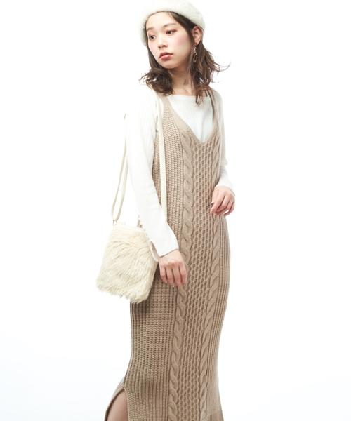 【2019SS natural couture】冬のレイヤードスタイルに欠かせない、ニットジャンドレ今期注目のジャンドレに、シーズンムード高まるニットで仕上げたアイテムが仲間入り!柔らかな風合いのニットに、ざっくり編まれたケーブルデザインが、レディライクなキャミワンピース。ハイネックやトレーナーに合わせたレイヤードスタイルをお楽しみ頂けます。肩のアジャスターで長さ調整が可能なので、低身長から高身長まで幅広くマッチします。膝下の上品なロング丈も、サイドにスリットが入っており動き易さも◎甘過ぎないデザインは、大人の女性にもオススメな1着です。