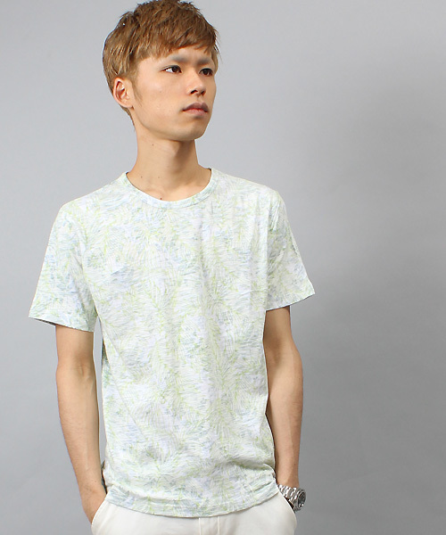 トロピカル・亜熱帯・リゾート等のキーワードを連想させる 南国の植物柄を全体にプリントしました。 少しトーンを抑えて擦れた雰囲気を表現するために プリントした方を裏にして製品に仕上げています。 存在感がありながらも派手すぎないので、 これ1枚で着用したりジャケットのインナーに着用したりと 色々なコーディネートが楽しめそうです。 ※山本さん着用カラーはグリーン「スマート5月号」でコーディネート着用している商品は、 【関連商品】の欄をご覧下さい。 ショップにて在庫をお探しの際は、下記の品番をお申し付け下さい。 品番【M0141UTS407】