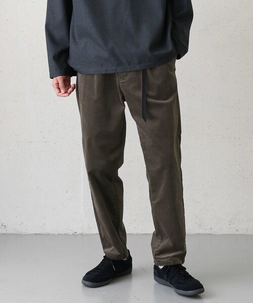 シンプルでありながらも、繊細なモノ作りで"ユニークさのあるベーシック"を提案するジャパンブランド【STILL BY HAND(スティルバイハンド)】より、ベロア生地を用いたトラウザー。通常の綿ベロアよりも細番手の新疆綿を採用することで、なめらかな肌触りと上品な光沢をプラス。伸縮性に優れるストレッチ混で、穿き心地も快適。程よくゆとりの中太の緩やかなテーパードシルエット。「BROWN(ブラウン)」「NAVY(ネイビー)」「CHARCOAL(チャコール)」でラインナップ。※この商品は、特有な光沢や風合いをもったベロア生地を使用しております。大変デリケートな性質があり、着用中の摩擦により下着などに毛羽が付着することがありますが、外観への影響はありません。
