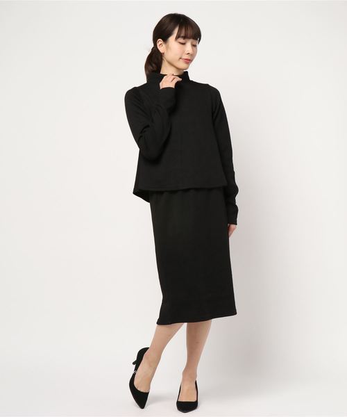 ふんわりとフレアシルエットが出るハイネックトップスとタイトスカートのセットアップ。膝の隠れるロング丈ボトム×ショート丈のトップスが好バランス◎【素材・サイズ感】リブ編みのニット素材で厚すぎず、ロングシーズン着られるアイテム。ボトムはウエストゴムなので着脱も楽々。トップスはゆとりのある身幅とフレアシルエットで、腰回りのラインを拾わずカバー。【スタイリング】別々にも使えるので手持ちのアイテムと合わせても可愛い、お得なセットです。ウエストゴム有りです。