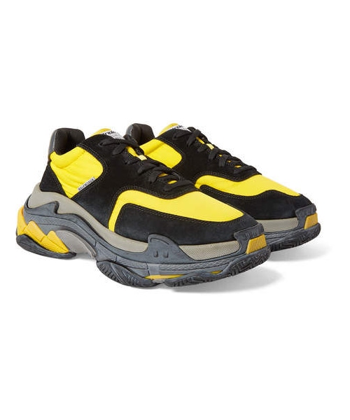 Since their AW17 debut, Balenciaga 's 'Triple S' sneakers have become something of a sensation - check out the Instagram tag that's been used a staggering 600, 000 times. Instantly recognisable by chunky three-layer soles that are moulded from running, basketball and track styles, this version is made from a combination of smooth black nubuck, vivid yellow nylon and grey leather. Try them with a full sweatsuit or even with tailoring. Shown here with Balenciaga jeans, Maison Margiela sweater, Maison Margiela T-shirt, Balenciaga pouch. - - Black nubuck, yellow nylon, grey leather - Designer emblem, mesh linings, rubber soles - Lace up - Come with dust bag - Imported