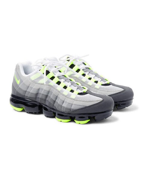 Nike 's 'Air Max 95' and 'Vapormax' sneakers are iconic in their own right, but a hybrid of the two? Now that's worthy of some serious hype. This low-top pair recalls the original design that debuted in the mid '90s, from the grey gradient faux suede upper to the hints of neon-green, but is updated with bold black rubber soles that provide plenty of cushioning. Shown here with Off-White hoodie, Off-White shirt, Off-White T-shirt, Acne Studios jeans. - - Tonal-grey faux suede, white and black mesh - Pull tabs, designer emblems, reflective trims, fleece linings, rubber soles - Lace-up - Designer colour: Black/ Volt/ Medium Ash/ Dark Pewter/ Dusk Granite - Nike follows its own size conversion, therefore the size stated on the box will differ from the one provided in our conversion chart. To receive your correct fit, please refer to Size and Fit notes - Imported