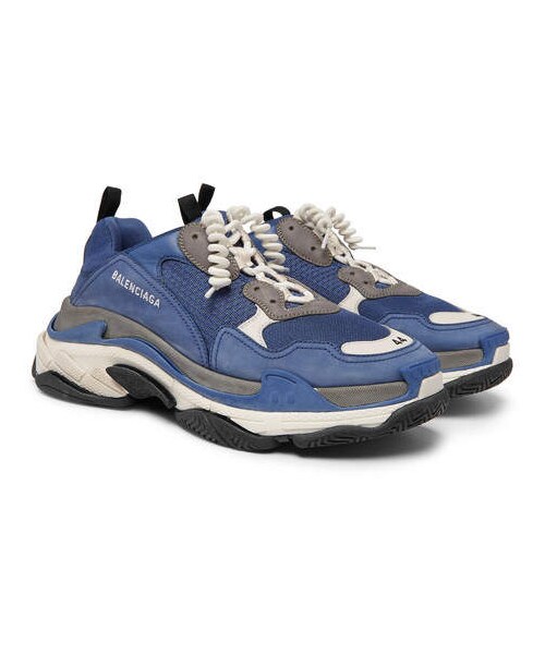 Balenciaga 's Mr Demna Gvasalia is really committed to bringing chunky sneakers back - in fact, to get his design just right, he stacked up three different rubber sole moulds (hence the 'Triple S' moniker). This pair is made from suede and leather-panelled mesh and has the European sizing embroidered at the toes. - - Royal-blue mesh, grey and indigo suede, white and royal-blue leather - Pull tabs, designer emblems, mesh linings, rubber soles - Lace-up - Come with dust bag and spare laces - Imported