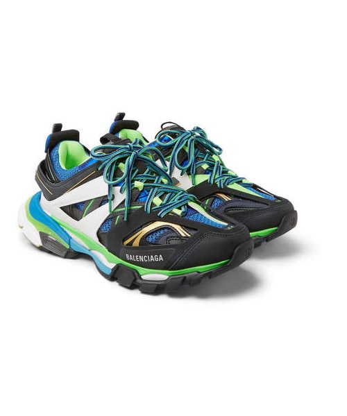 The layered uppers of Balenciaga 's 'Track' sneakers are inspired by both classic hiking and running styles – so much so that the label fused together 96 different technical components to make them look like an authentic amalgamation. They're made from leather, mesh and rubber and set on nine-piece rubber soles. Like the house's other signature kicks, they're embroidered with the European shoe size on the toes. - - Black, green, blue and white leather, mesh and rubber - Pull tabs, designer emblems, embroidery, mesh linings, rubber soles - Lace-up - Come with dust bags and spare laces - Imported
