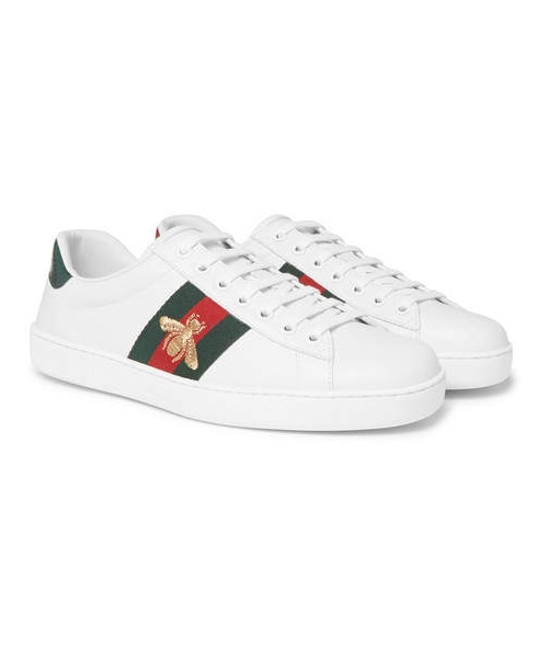 Gucci 's low-top sneakers are patterned with the brand's signature striped webbing and a gold bee – you'll find the motif carved into marble all over Rome, where the label is based and Mr Alessandro Michele grew up. This pair is made from soft white leather and has mismatched metallic watersnake heel tabs. Shown here with Gucci hoodie, Gucci shirt, Gucci trousers. - - White leather - Watersnake heel tabs, red and green striped webbing sides, gold embroidery, leather linings, rubber soles - Lace-up - Watersnake: Indonesia - Made in Italy