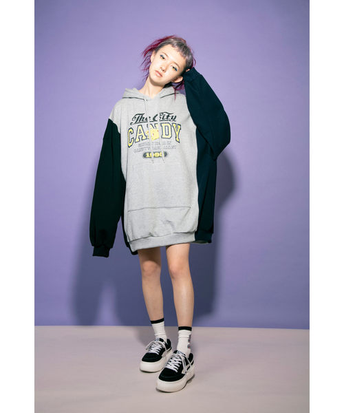 2枚のスウェットをリメイクしたようなオーバーシルエットのワンピース。 かすれた風合いのカレッジプリントでUSEDテイストな仕上がりに。 ・実際の商品はサンプルの為、仕様や加工、サイズ等が若干異なる場合がございます。予めご了承ください。