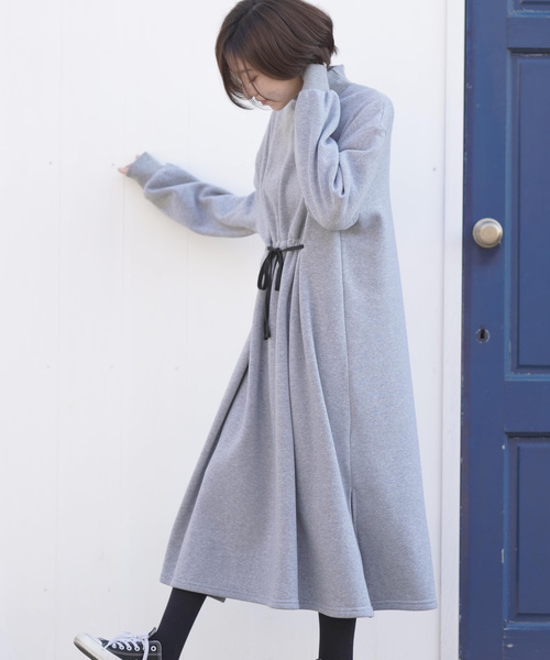 きゅっと絞ったウエストがポイントの裏起毛スウェットワンピ裏起毛が暖かい軽くて着心地の良いスウェットワンピース。リブ切替のハイネックがカジュアルなデザインでラフにご着用いただけます。前身頃のウエスト部分にひもを入れてきゅっと絞った変わりブラウジング。フロント部分だけを絞るのでXラインを描いてすっきり着こなせます。裾のスリットは足さばきも良くレイヤードにもピッタリ♪裏地なし裏起毛伸縮性弱中厚ウエストひも取り外し可洗濯:手洗い可