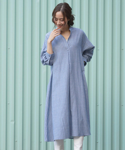 清潔感のあるストライプシャツワンピース ブルー系のストライプが明るく清潔感のあるシャツワンピース。 柔らかなコットンミックスの素材なのでロングシーズンお楽しみいただくことができます。 襟元を重ねた立体的なスキッパーで抜け感のある着こなしに。 また、ノーカラーなので女性らしいフェミニンな印象を与えます。 ふわっと広がるフレアラインも魅力♪ 裏地なし 伸縮性なし 薄手 袖口ボタン開閉可 織りキズやだま等みられる場合もございます 洗濯:手洗い可