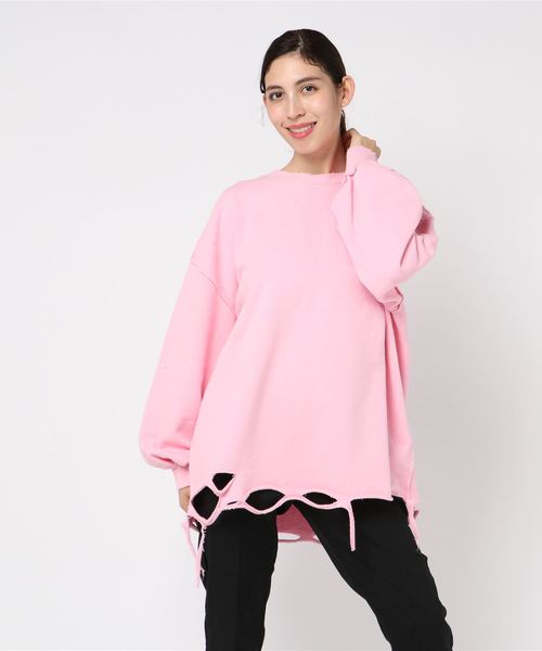 肩や裾に施されたクラッシュ加工がアクセントに☆程よくゆとりのあるシルエットで、ゆったりと着用していただける1枚。レギンスパンツやジャージパンツとも相性抜群◎